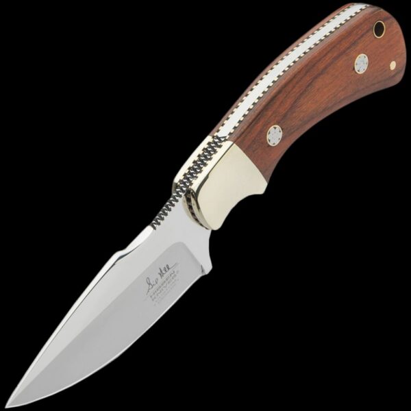 Knifemaker extraordinaire Gil Hibben continues to design exceptional knives made for hard everyday use. His Diamondback is a smaller fixed-blade designed to fit comfortably on your side. The knife has a 3 5/8" full-tang, 7Cr17 steel blade with brass fileworked accents along the tang, extending from a nickel silver bolster with a high-polish finish. The handle scales are a rich, reddish brown pakkawood, accented with detailed mosaic pins and secured with nickel silver pins. The 7 7/8" overall fixed blade slides securely into a premium leather sheath and the handle has a brass lanyard tube.