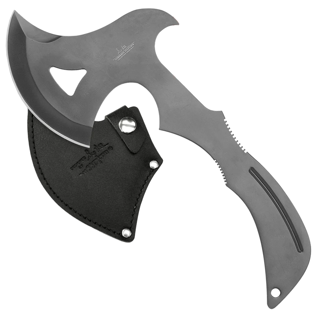 Perfectly balanced with one-piece tempered stainless steel construction. The Pro Thrower Axe has a trigger-grip design that guide it into the same consistent and accurate release each time they are thrown. Includes leather sheath. 12" overall.