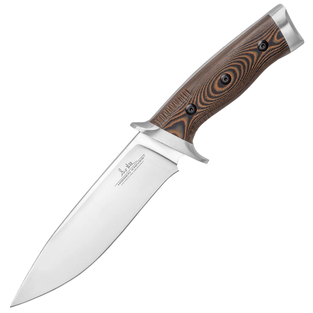 This knife was designed by master knife maker Gil Hibben, an avid hunter and fisherman. His firsthand experience as an Alaskan hunting guide contributed to the design of this custom knife. It has a full-tang, 6 1/2” razor-sharp 420HC stainless steel blade, complemented by a stainless steel guard and pommel. The handsome CNC machined, layered Micarta handle scales have a knothole pattern and are secured to the tang by heavy-duty screws. The handle features ridges just below the handguard to improve control when using the knife. The 11” overall length, fixed blade knife slides securely into a premium black leather belt sheath with a snap closure.