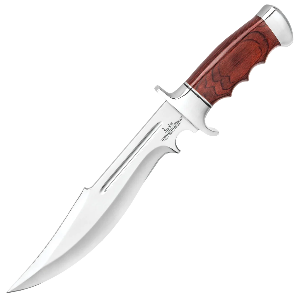 Gil Hibben has a history of designing knives for Sylvester Stallone to feature in his films. The custom-designed bowie, the Legionnaire, is one of his exceptional movie knives and, now, he releases a second version. A rich dark brown pakkawood handle complements the mirror-polished finish of the guard and pommel. The bowie knife has a keenly sharp, 9 1/2" 7Cr17 stainless steel blade, also, with a mirror-polished finish. A premium leather belt sheath protects the blade and provides a comfortable option of carry.