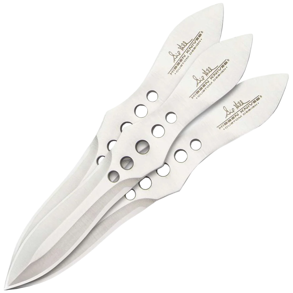 As a member of the International Knife Throwing Hall of Fame, Gil Hibben knows throwing knives and what design elements are necessary for the perfect throw. Perfect your throwing skills with the Hibben Three-Piece Master Thrower Set. Each 8" overall knife is one-piece of 3Cr13 stainless steel with a 3 3/4" double-edged blade with a penetrating point. The handle is comfortably curved and there are five weight-reducing thru-holes, it comes to a thick point at the end. All three of the throwing knives fit in a tough nylon belt sheath with a snap strap that secures the handles.