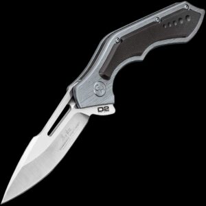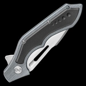 - The handle is CNC machined 6061 aircraft aluminum with a satin finish, a grey anodized coating and has black G10 handle scale accents