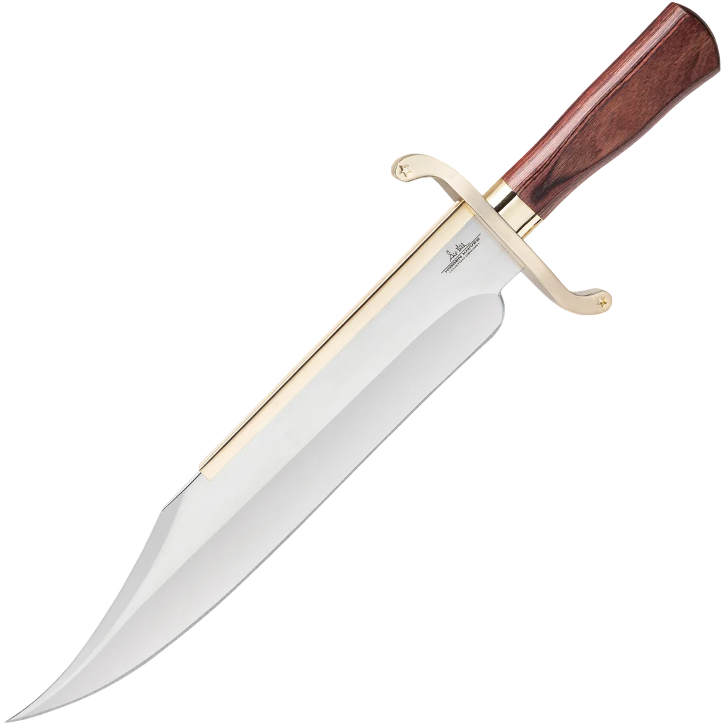 Knifemaker extraordinaire Gil Hibben continues to design exceptional knives made for hard everyday use and the Gil Hibben Old West Bowie Knife – Bloodwood Edition takes it even further! Take it with you into the most untamed environments and use it under the harshest conditions. It has a keenly sharp, 14" stainless steel clip point blade with a high-polish finish and a beefy profile. The red-brown, natural-look wooden handle is complemented by a gold-plated blade catcher and handguard. A custom leather belt sheath protects and stores the massive bowie knife. This is a BudK Exclusive design, which has been reimagined by Gil Hibben, and brought back for a very, very limited time. Don’t let this one get away!