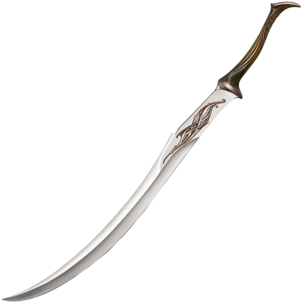 Officially Licensed Mirkwood Infantry Sword and Display from The Hobbit. The Mirkwood Infantry are soldiers of the Woodland Guard, Silvan Elves tasked with protecting and watching over the great forest of Mirkwood, Thranduil's kingdom. They are skilled in the use of various weapons including the bow and sword. The Mirkwood Infantry Sword is an elegant and effective Silvan design, crafted with a two-handed grip and an Elven blade forged of Silvan steel, ornately decorated with flowing Elven designs. This United Cutlery collectible replica features bronze-finish cast metal hilt parts, a composite grip, and a stainless steel blade with cast metal ornaments. It is presented with a wooden wall display (mounting hardware and instructions included) featuring a Wood Elf graphic motif, and includes a certificate of authenticity.
