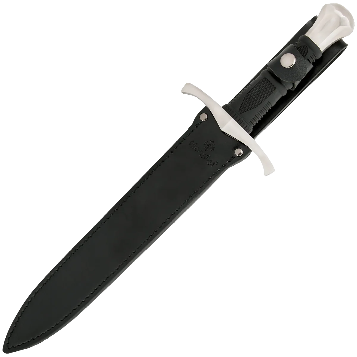 The Honshu Crusader Quillon D2 Steel Dagger is a striking blend of medieval design and modern craftsmanship. With an impressive overall length of 18 5/8" and an 11 7/8" D2 steel blade, this dagger offers unmatched durability and cutting power. Weighing 2.2 pounds, it delivers a substantial, balanced feel in hand, making it ideal for both display and functional use. The included premium leather sheath ensures safe storage and adds a touch of classic elegance.