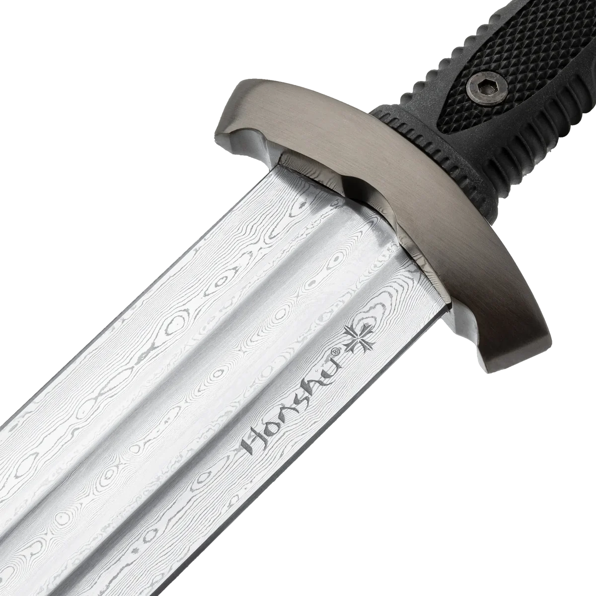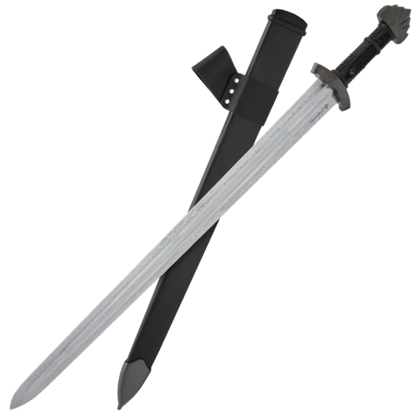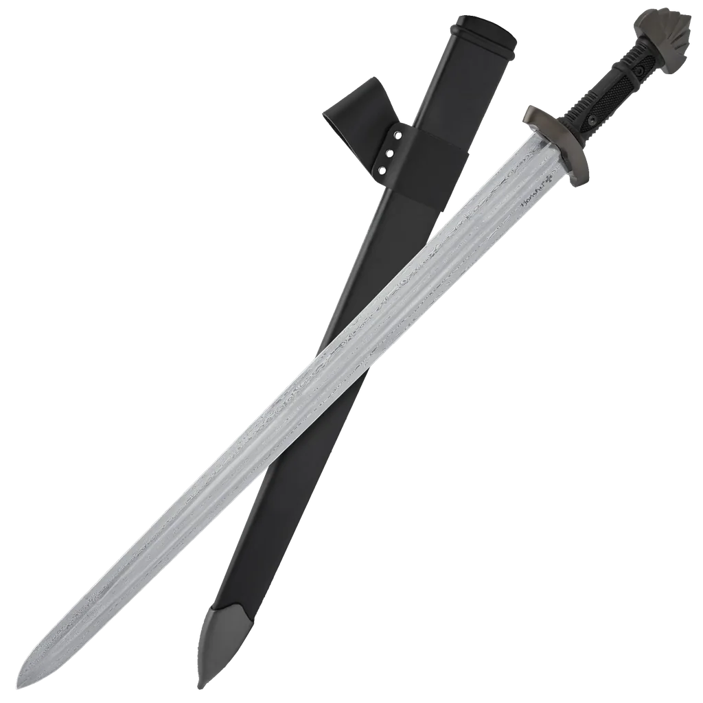 The Honshu Damascus Viking Sword is a striking blend of historical craftsmanship and modern refinement. Measuring 38 1/2” overall, this sword features a 1060 carbon steel blade with a stunning Damascus steel pattern, creating a mesmerizing blend of swirling textures and razor-sharp performance. The 4mm thick blade is built for durability, while the ornate pommel and hilt design reflect the legendary craftsmanship of Viking warriors. Designed for control and comfort, the black thermoplastic rubber handle provides a secure, slip-resistant grip, ensuring precise handling. The 5” point of balance enhances maneuverability, making it ideal for reenactments or display. A wooden scabbard with a semi-gloss black finish offers both protection and a commanding presence, while the included black leather frog allows for versatile carrying options.