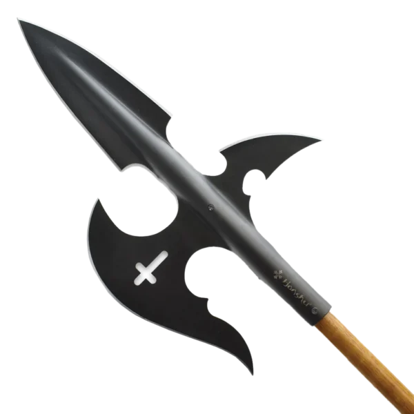 • The halberd blade features an S-shaped edge, with a cross-shaped cutout in the middle of the blade.