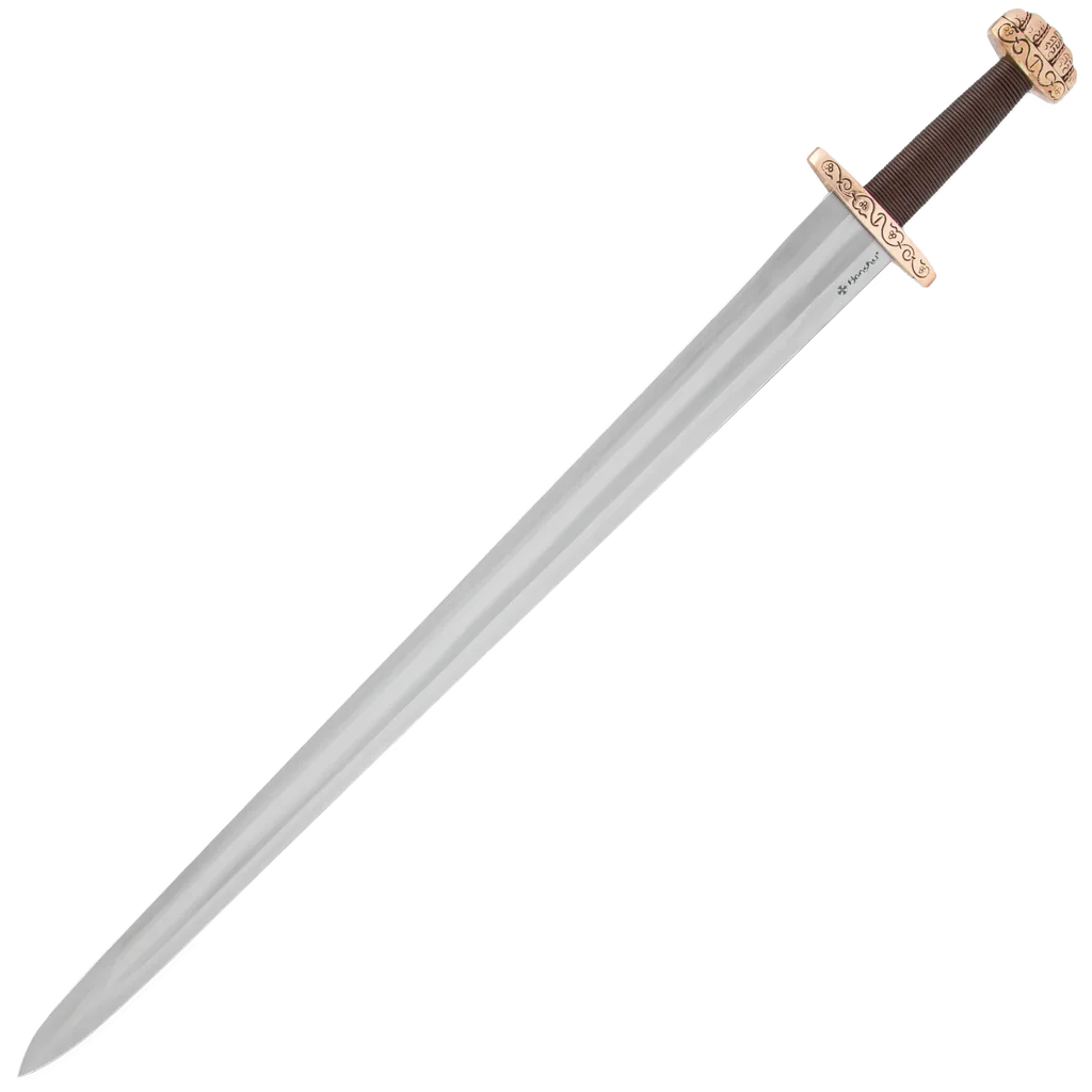 Crafted with meticulous attention to detail, this sword pays homage to the legendary Ballinderry swords of ancient times. Forged from premium 1065 carbon steel with a Rockwell Hardness of 47-52, the double-edged blade offers exceptional durability and a sharp cutting edge. Whether you're engaging in historical re-enactments, honing your martial arts skills, or adding a centerpiece to your collection, this sword is ready for action. With a 29 1/2" long blade and an overall length of 35", this sword provides excellent handling and versatility. The hardwood handle, wrapped in rich, dark brown leather, provides a superior grip, ensuring precise control. The pommel and guard, cast in brass with a brilliant polish and traditional vine scrollwork, add an exquisite touch to this remarkable sword.