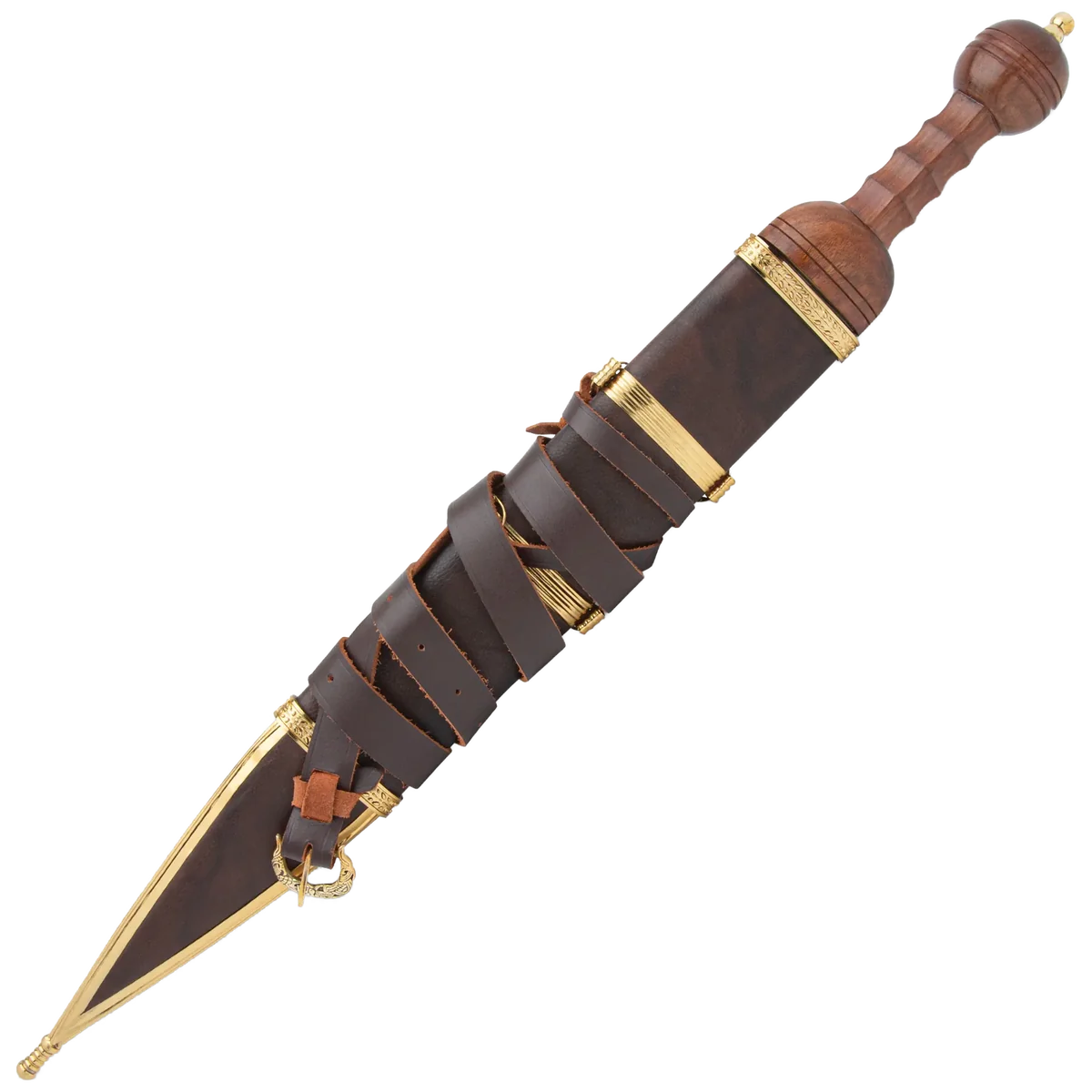 The Honshu Historic Forge Roman Mainz Pattern Gladius is a remarkable piece that transports you back to the days of ancient Rome. Crafted with meticulous attention to detail, this sword features an authentic Roman Mainz Pattern Gladius design, making it a must-have for historical enthusiasts and collectors. With a 20 1/4" Carbon Steel double-edged blade, this gladius is designed for exceptional cutting power. The wooden handle with a round pommel and grooved grip offers a comfortable and secure hold, allowing for optimal control and maneuverability. The leather wrapped scabbard with a strap and gold colored accents not only provides a protective casing for the gladius but also adds a touch of elegance and style to its overall appearance. It can be used for historical reenactments, or as a display item for enthusiasts who appreciate the rich history of ancient Rome. The exceptional craftsmanship, attention to detail, and historical accuracy make this gladius a valuable addition to any sword collection.