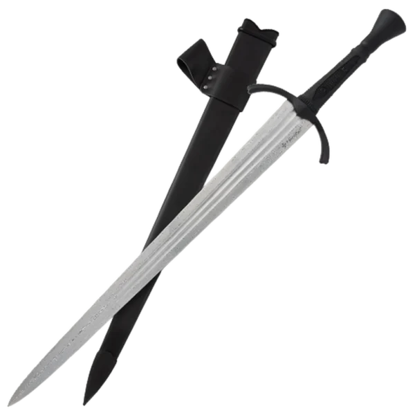 The Honshu Single-Handed Damascus Broadsword combines timeless beauty with modern strength, featuring a 30 1/2" Damascus steel blade with a full-length fuller for reduced weight. Measuring 39 1/2" overall, it balances reach and control, supported by a textured black TPR grip with steel guard and pommel for durability. A black scabbard with removable belt attachment completes the design, making this broadsword both visually striking and built for lasting reliability.