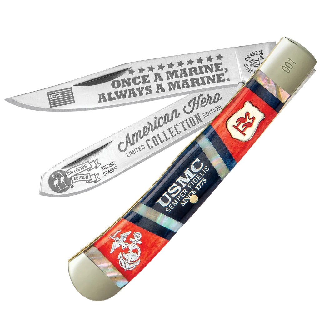 This eye-catching pocket knife, from Kissing Crane’s American Hero Collection, pays homage to America’s brave Marines with bold, colorful handle accents, USMC-themed blade etchings and construction that’s nothing short of “Marine tough.” Both elegant and field-capable, it features razor sharp clip and spey blades crafted from resilient 440 stainless steel. The distinctive handle is comprised of genuine bone, pearl and resin scales, enhanced with a vibrant red, white and blue color scheme, as well as engraved text and art. “USMC” and “Semper Fidelis” are etched into the handle with the iconic US Marine winged anchor insignia. A must-have for any cutlery or military collection. It also makes a fantastic everyday carry and a heartfelt, memorable gift for a Marine in your life.
