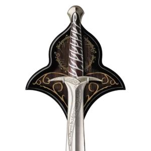 Sting was carried by Frodo Baggins on his quest through Middle-earth in the Lord of the Rings trilogy. Forged by elven smiths in the First Age, the blade glows blue when orcs or Saruman’s fearsome Uruk-hai are near. This proved invaluable countless times throughout Baggins’ epic quest into the heart of Mordor to cast the one Ring into the fires of Mt. Doom. This replica mirrors the prop used in the Lord of the Rings trilogy down to the last detail, including the flowing Sindarin inscription on the blade and guard. The ancient text translates to “Sting is my name; I am the spider’s bane,” referring to the spider Shelob – slain by Frodo in the dark pass of Cirith Ungol.