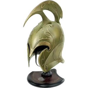 The high sophistication of the Elven race carried over into the design of their armor and weapons. Their war helms had the appearance of being beaten out of a single sheet of a bronze-like alloy, with decorative raised golden vines adorning the surface. Embossed into the nose guards were the Elvish runes signifying that these soldiers were under the command of Gil-galad, the last King of the Ñoldorin High Elves. This authentically detailed replica is a reproduction of the actual filming prop used in The Lord of the Rings: The Fellowship of the Ring presented by New Line Cinema. The helm is crafted of reinforced polyresin, with precisely-molded details and coloring. Each helmet is presented with a wood display stand and a brass medallion. This adult collectible is strictly limited to 5000 pieces worldwide and is individually hand serial numbered inside the helmet to ensure authenticity. Helm Material: Fiberglass-reinforced resin, Elven vine design with an antiqued finish, genuine leather lined interior. Display: 9-1/2" x 9-3/4" x 6-7/8" wood, burned-edge finish, gold silk screen, brass medallion. Hardware, instructions included.