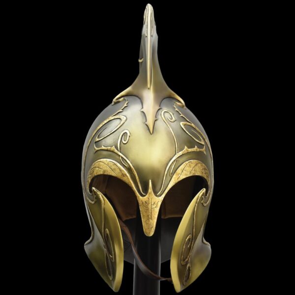 The high sophistication of the Elven race carried over into the design of their armor and weapons. Their war helms had the appearance of being beaten out of a single sheet of a bronze-like alloy, with decorative raised golden vines adorning the surface. Embossed into the nose guards were the Elvish runes signifying that these soldiers were under the command of Gil-galad, the last King of the Ñoldorin High Elves. This authentically detailed replica is a reproduction of the actual filming prop used in The Lord of the Rings: The Fellowship of the Ring presented by New Line Cinema. The helm is crafted of reinforced polyresin, with precisely-molded details and coloring. Each helmet is presented with a wood display stand and a brass medallion. This adult collectible is strictly limited to 5000 pieces worldwide and is individually hand serial numbered inside the helmet to ensure authenticity. Helm Material: Fiberglass-reinforced resin, Elven vine design with an antiqued finish, genuine leather lined interior. Display: 9-1/2" x 9-3/4" x 6-7/8" wood, burned-edge finish, gold silk screen, brass medallion. Hardware, instructions included.