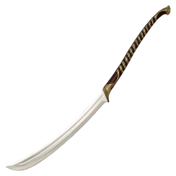This officially licensed and superb quality reproduction item is an exact replica of the High Elven warrior sword that appears in the opening battle sequence of The Lord of the Rings movie trilogy. Measuring 49 3/4" overall, this elegant and deadly sword features a 24" tempered, 420 stainless steel, false edged blade. The precision cast metal handle offers a simulated leather grip accented with brass-plated Elven vine designs. This item includes a 23" x 9" x 3/4" wooden display plaque with silkscreen design and a certificate of authenticity.