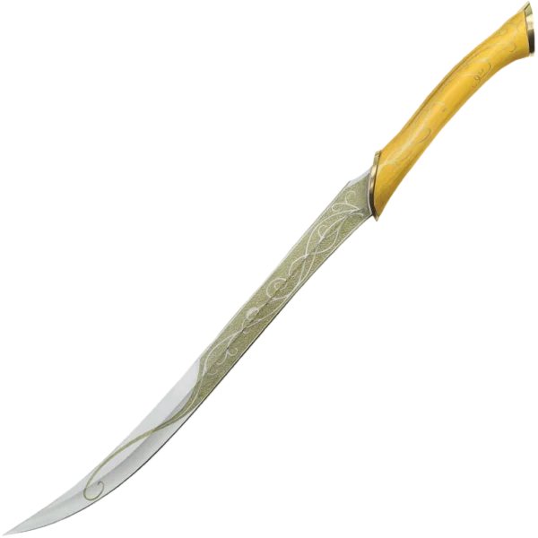 - Tempered, 420 J2 stainless steel, sharp-edged. Deep-etched intaglio design with a gold-tone color. Full length tang construction. Solid American oak with an Elven vine design, cast metal guard and pommel.