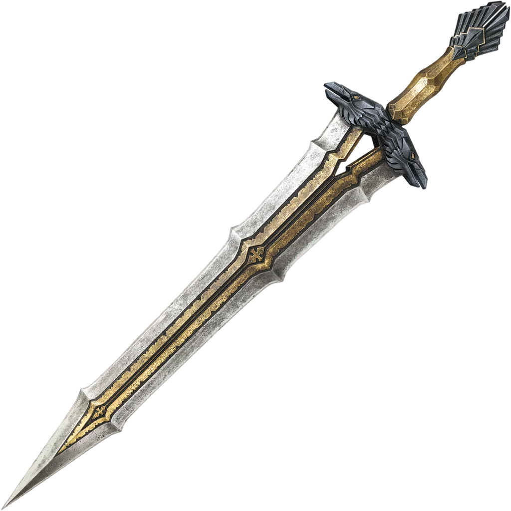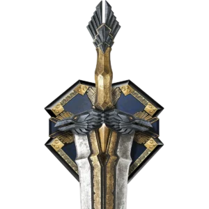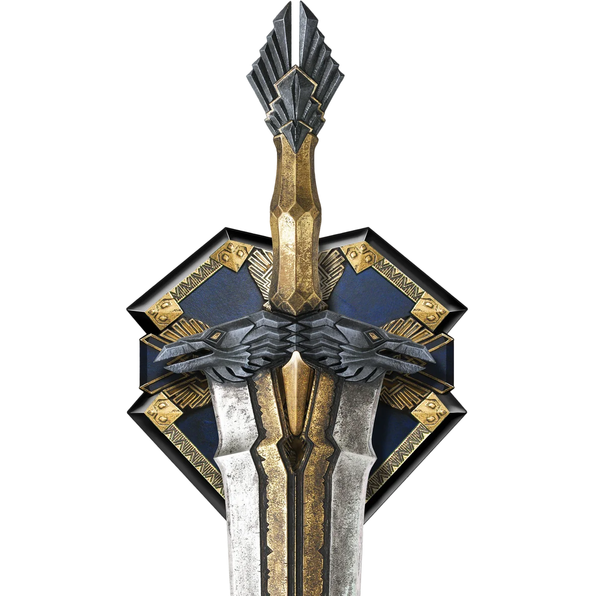 A Polyresin prop replica of the iconic Dwarven sword wielded by king Thror in The Hobbit: An Unexpected Journey™, now inherited by his grandson Thorin Oakenshield in The Hobbit: The Battle of the Five Armies™. The design of this richly detailed prop represents the regality of the Dwarven kingdom of Erebor™, featuring an ornately sculpted raven hilt with gold accents and a gold inlaid blade. Crafting this massively thick sword blade in real steel was not possible outside of Middle-earth, so we have exactly replicated the uethane and aluminum filming prop in polyresin with screen-accurate detailing, hand-painted colors, and weathering effects. Comes with a 3-dimensional poly stone wall display sculpted to match the styling of Thorin's regal war shield. Each piece is individually serial numbered and includes a certificate of authenticity.