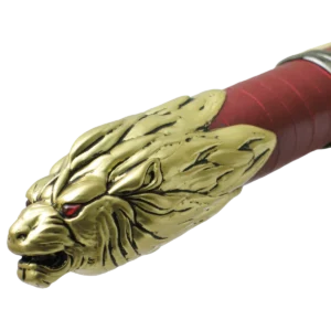 This officially licensed Oathkeeper from A Song of Ice and Fire series is limited to 2500. Unlike HBOs Oathkeeper, this sword is built to replicate the sword as described by author George R.R. Martin in the books. The blade is forged from high carbon damascus steel in a deep crimson red; a close inspection of blade reveals the patterning akin to rippled water created by the folding and melding of different steels into a single blade. The crossguard and pommel are plated in 24k gold with an antiqued finish. The grip is overlaid in tightly bound red leather. The sword comes with a plaque of silkscreened fiber board – mounting hardware is included.