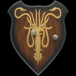- The axe comes with a wooden vertical wall mount that is silkscreened with the Kraken Sigil of House Greyjoy. Mounting hardware included.