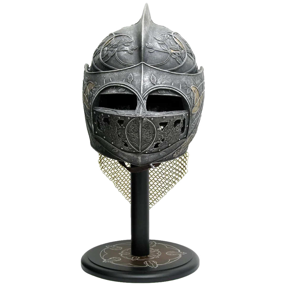 Ser Loras Tyrell, also known as the Knight of Flowers, is a knight of House Tyrell and the third son of Lord Mace Tyrell of Highgarden and his wife, Lady Alerie Hightower. Loras is a highly skilled knight and jouster. Loras purchased his armor from Tobho Mott's shop in the Street of Steel in King's Landing. During the tourney on Prince Joffrey's name day in 298 AC, Loras defeated Ser Hosteen Frey and Ser Jaime Lannister of the Kingsguard in the joust. This helm, like his armor, epitomizes his character and flair for style and martial skill. The Helm of Loras Tyrell is an officially licensed Game of Thrones collectible and limited to a production run of 1000. The helm is crafted in lightweight fiberglass to make it lighter and more wearable. It is finished for an antiqued steel and bronze appearance. Attached to the helmet is a beautiful aventail of golden brass chainmail rings. It has a hinged visor and a hinged faceplate – the tension of these pieces can be adjusted by use of an internal allen screw. The interior of the helm is lined with fabric coated padding. The lower faceplate is lined with soft brown leather and has a brass plate etched with the production number. spacer The Helm comes with a wooden stand silk-screened with the sigil of House Tyrell. Stand hardware included. Also comes with a Certificate of Authenticity.
