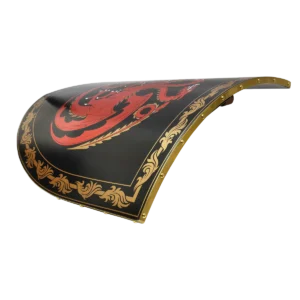 Introducing the Shield of Daemon Targaryen, an officially licensed masterpiece from HBO®'s House of the Dragon®. Crafted with canvas-wrapped wood, brass trim, and genuine wood straps, this limited-edition shield not only captures the essence of Targaryen heritage but also features a versatile wall mount to display up to three swords. With only 1000 pieces available, each accompanied by a certificate of authenticity, this is a must-have for any true fan of Game of Thrones ® or House of the Dragon ®. • Own a Piece of History – Display a meticulously crafted shield with authentic materials and intricate detailing, making it a must-have for die-hard House of the Dragon® enthusiasts. • Elevate Your Collection – This limited edition shield, complete with a certificate of authenticity, adds unparalleled value and prestige to your memorabilia collection. • Showcase with Pride – Easily mount your shield and up to three swords on your wall, transforming any space into a tribute to the Targaryen legacy. • True Authenticity – Not only is this the only officially licensed Targaryen shield authorized by HBO®, the canvas and wood construction is historically accurate and authentic to the time period of the story. Be one of only 1000 lucky owners with this exclusive shield of Daemon Targaryen. Add this stunning shield to your collection today! This item is a collectible reproduction. This replica shield is intended solely for display purposes as a collector's item. Official HBO Licensed Product © 2024 Home Box Office, Inc. All Rights Reserved. HOUSE OF THE DRAGON and all related characters and elements © & â„¢ Home Box Office, Inc. (s24). Produced under License by Jalic Inc.