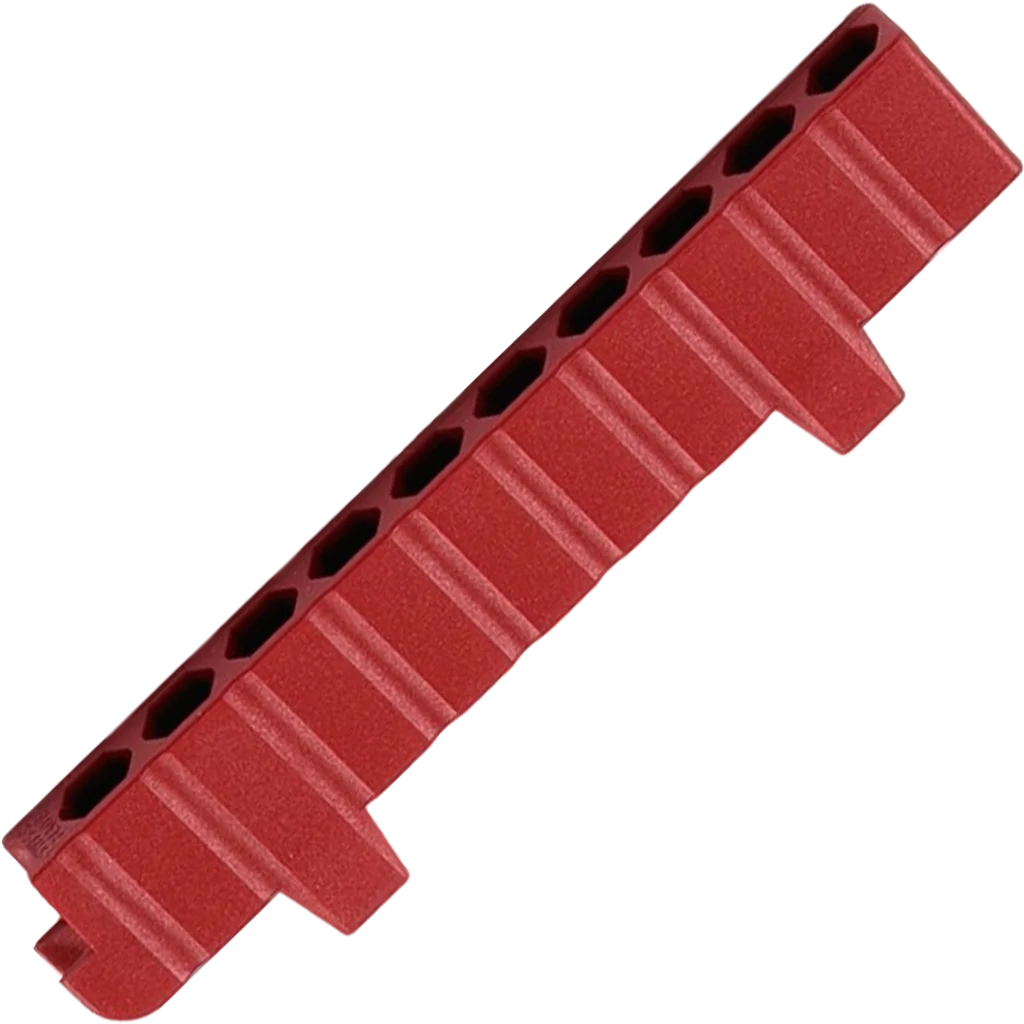 • The bit holder is made of red plastic and has compartments for ten bits and holders for the ratchet or bit wrench .