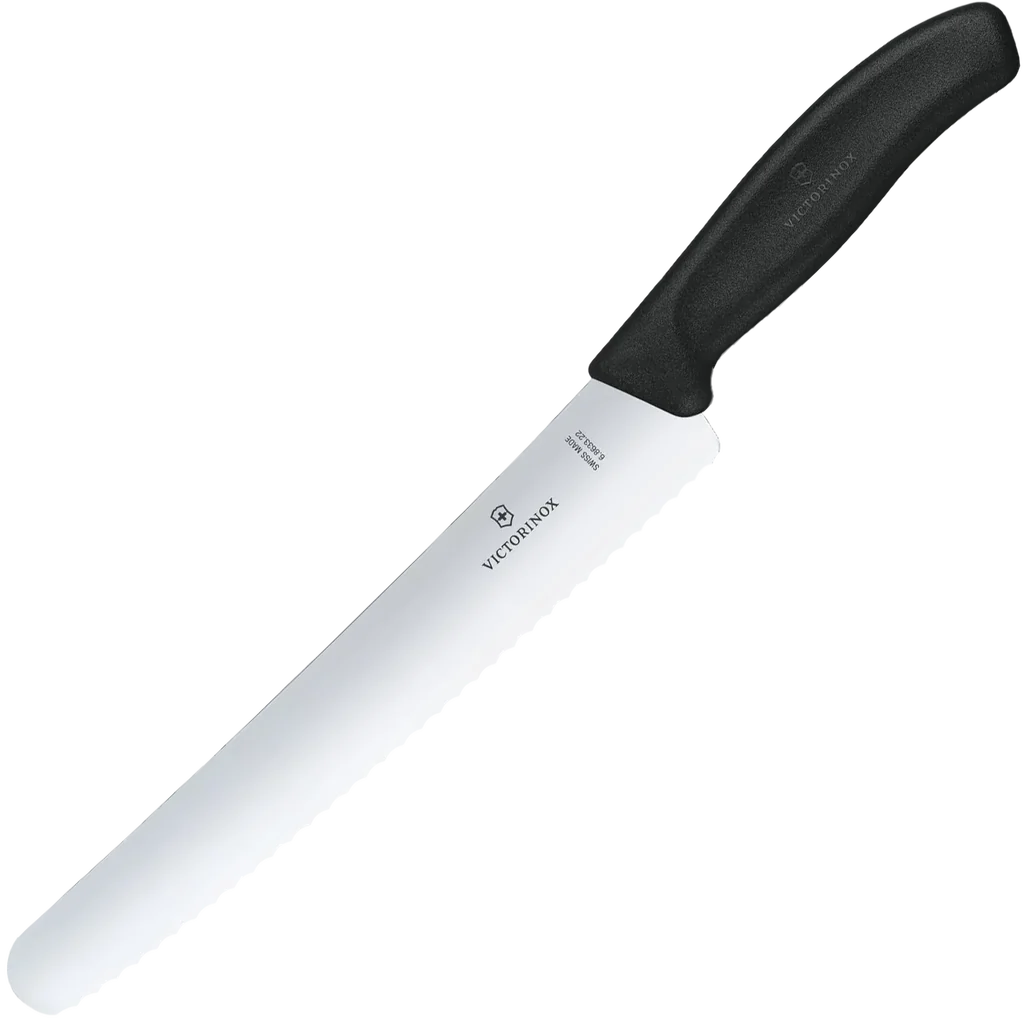 The Swiss Classic Bread and Pastry Knife has been designed to take care of all your baked-goods-related jobs in the kitchen. Similar in look and feel to the Swiss Classic Pastry Knife, this practical version has a 22 cm long curved blade with a rounded tip for icing and decorating cakes. It also has a wavy edge for effortlessly cutting through pastries, cakes and bread.