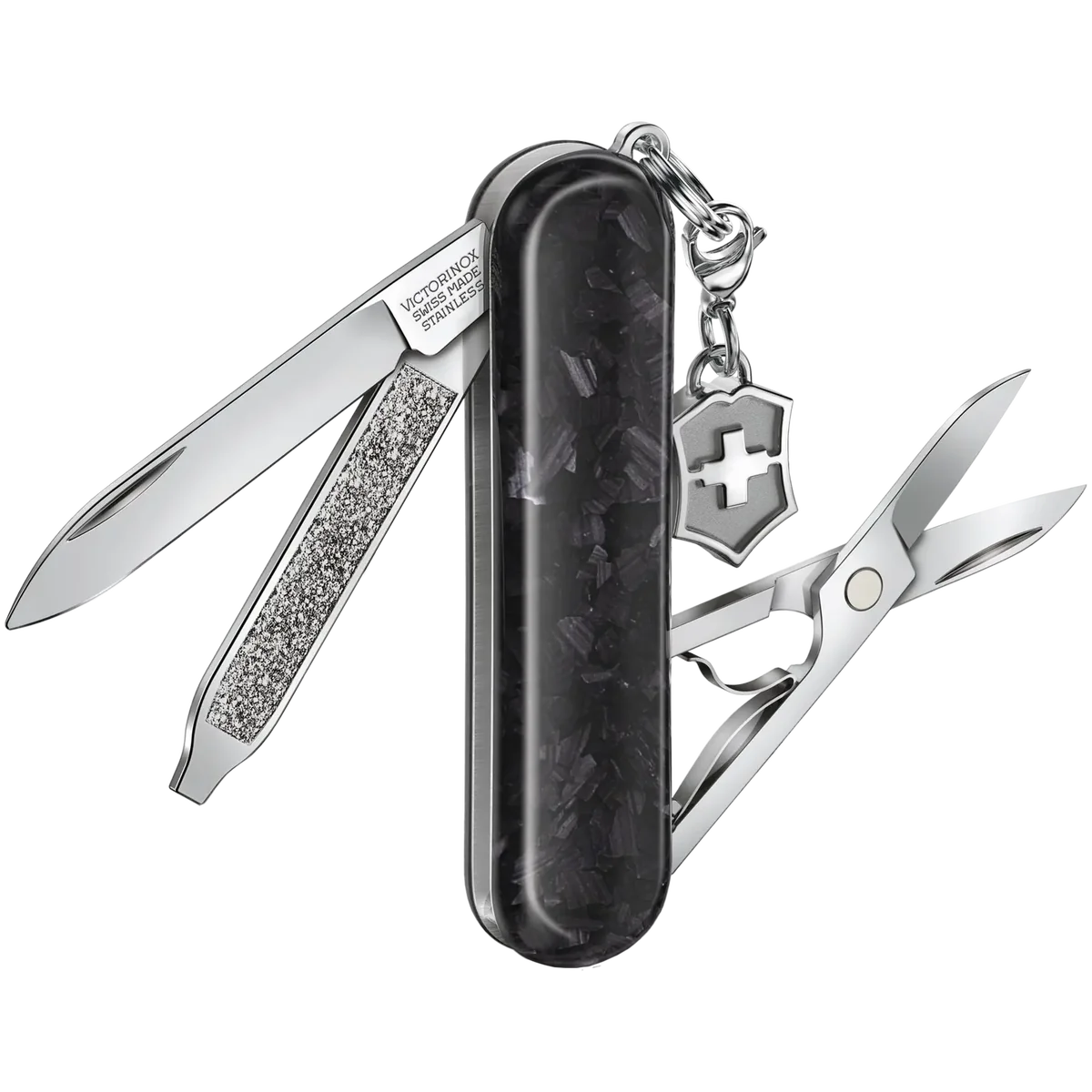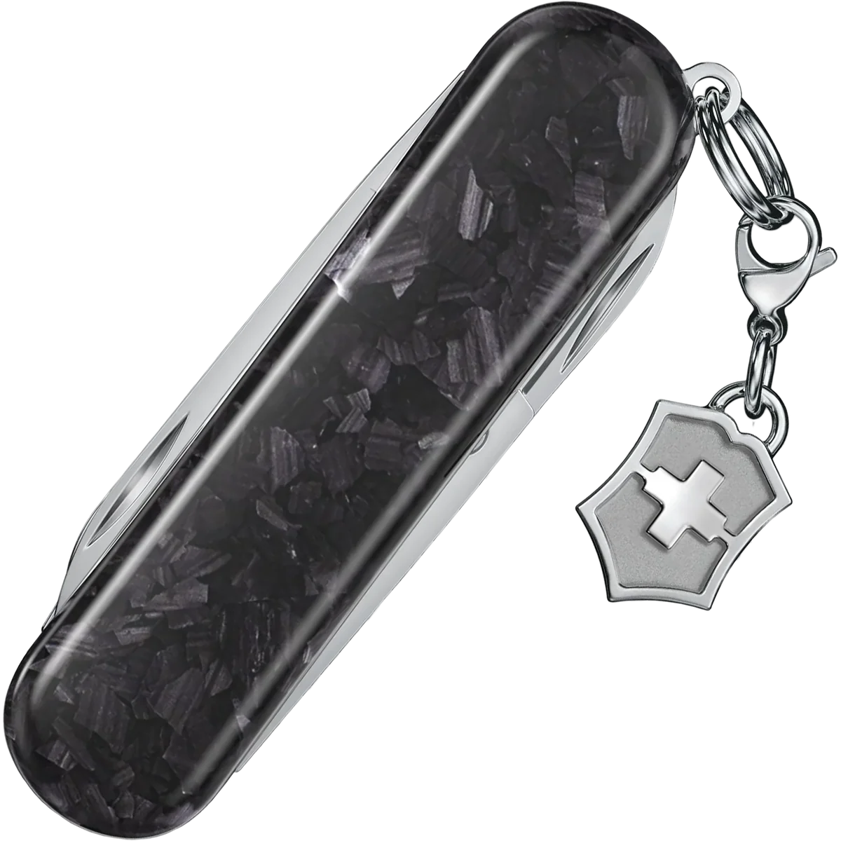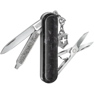 With its compact silhouette and high-tech aesthetic, this pocket knife embodies modern elegance. The Classic SD Brilliant Carbon is crafted from lightweight yet durable carbon fibre made from organic polymers, giving it strength without bulk. A matching cross and shield charm adds iconic Victorinox style. Embrace the future of indispensable multi-tools. Refined on the outside, strong on the inside—the Classic Brilliant collection is a cut above the rest. Choose from three stylish models to reflect your personality and lifestyle, from the dazzling glamour of the Crystal, the sleek resilience of the Damast and the high-tech elegance of the Carbon. Each piece is crafted from the finest materials and comes with a special gift box.