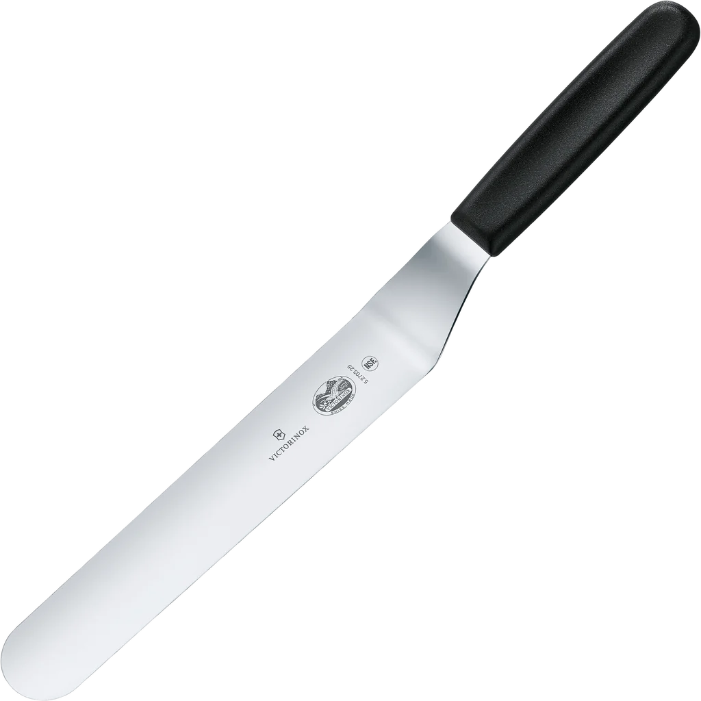 This Victorinox Spatula features an stainless steel palette knife blade that is razor thin and flexible. The offset allows for tidy icing while keeping the hand in a comfortable position away from the sides of the cake. From filling cakes to icing pastries, this spatula is indispensable in your commercial kitchen or simply at home! The semi-flexible metal surface won't waver and maintains its strength while lifting heavier items. The handle is comfortable and is made of black Polypropylene (PP) for precise control.