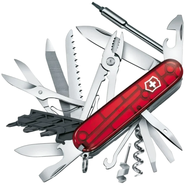 - Functions: Keyring, Large Blade, Small Blade, Nail File, Nail Cleaner, Tweezers, Toothpick, Scissors, Corkscrew, Can Opener, Bottle Opener, Mini Screwdriver (FH), Fine Screwdriver (FH), Small Screwdriver (FH), Screwdriver (FH), Metal Saw, Metal File, Wood Saw, Stainless Steel Pin, Ballpoint Pen, Wire Stripper, Wire Cutters, Wire Crimping Tool, Multipurpose Hook, Reamer Punch, Chisel, Pliers, Bit Wrench, Bits
