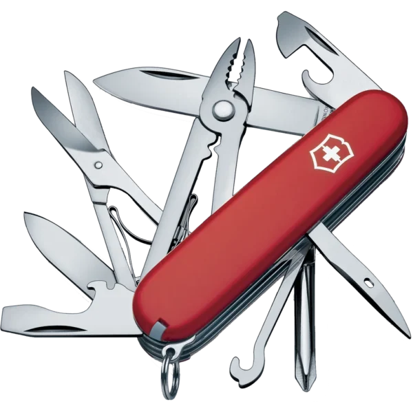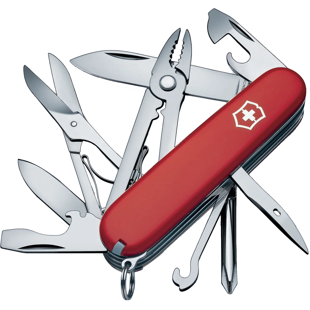 - Functions: Keyring, Large Blade, Small Blade, Tweezers, Toothpick, Scissors, Can Opener, Bottle Opener, Small Screwdriver (FH), Screwdriver (FH), Phillips Screwdriver, Wire Stripper, Wire Cutters, Wire Crimping Tool, Multipurpose Hook, Reamer Punch, Pliers