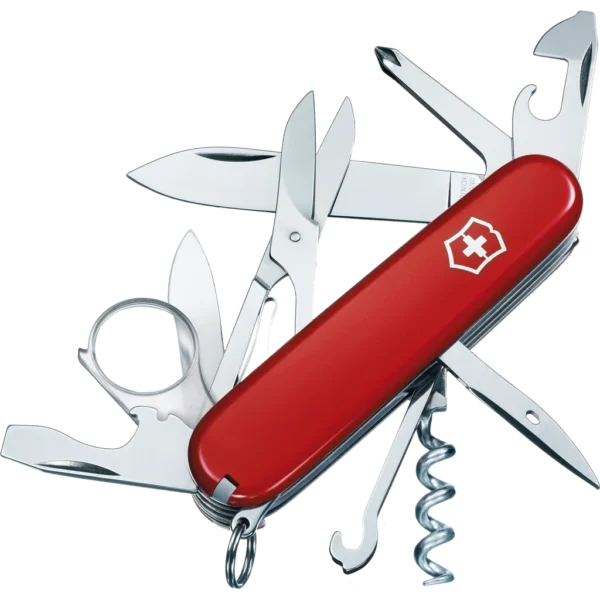 Welcome to the world of the Officer's knife. This is where the legend of the Swiss Army Knife began. And it continues today with the Explorer pocket knife. This pocket knife was built to help you figure things out. Its 16 functions include the tools you need to take just about anything apart and put it back together; and a magnifying glass so you can get a closer look in between.