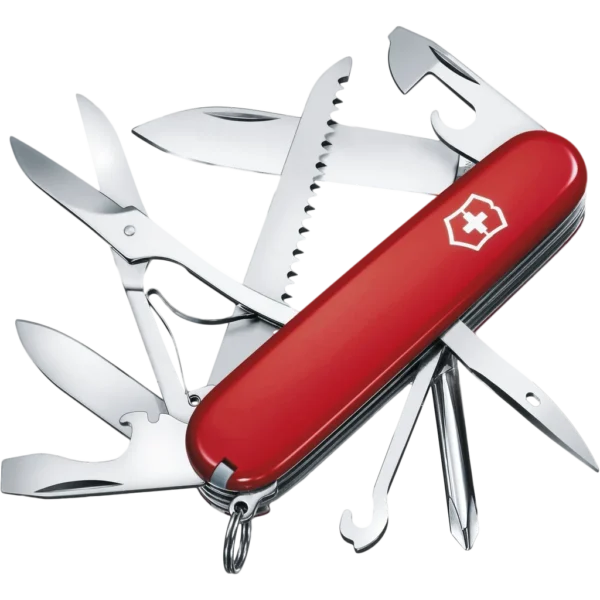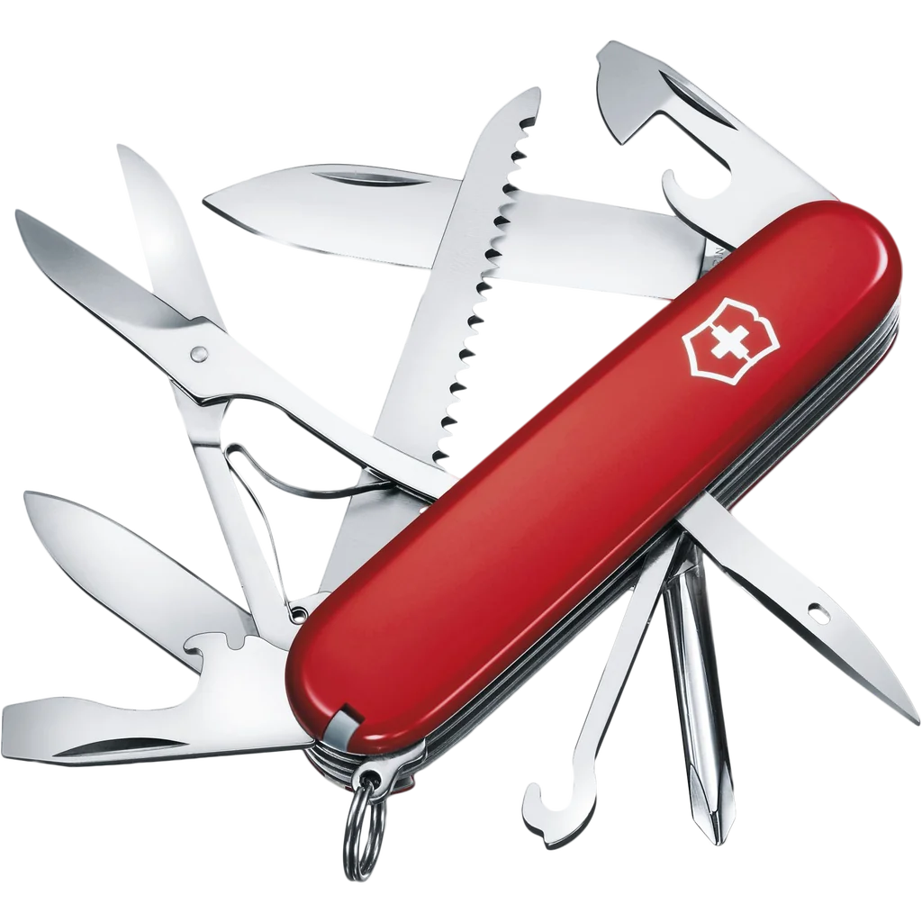 - Functions: Keyring, Large Blade, Small Blade, Tweezers, Toothpick, Scissors, Can Opener, Bottle Opener, Small Screwdriver (FH), Screwdriver (FH), Phillips Screwdriver, Wood Saw, Wire Stripper, Multipurpose Hook, Reamer Punch