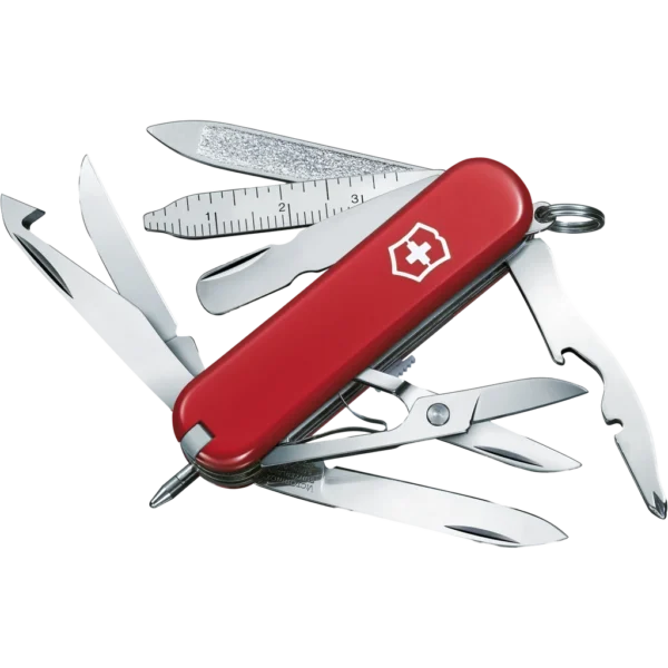 - Functions: Keyring, Small Blade, Letter Opener, Nail File, Nail Cleaner, Cuticle Pusher, Tweezers, Bottle Opener, Orange Peeler, Screwdriver (FH), Phillips Screwdriver, Ruler (cm), Ruler (inches), Ballpoint Pen, Wire Scraper