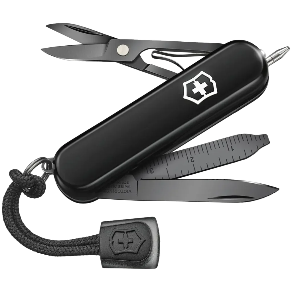 - Functions: Keyring, Small Blade, Scissors, Small Screwdriver (FH), Ruler (cm), Ruler (inches), Ballpoint Pen, LED, Lanyard