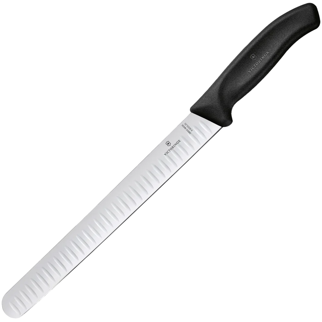 Slice the perfect cut for your family, your guests and yourself. No matter what you're serving, the Swiss Classic Slicing Knife makes easy work of juicy roast beef and tricky turkeys alike. Its ergonomic handle fits perfectly into your hand and the fluted edge makes sure every meat glides effortlessly off the blade. In short: bon appetit!