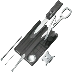 You'll be amazed at how many tools we've packed into the SwissCard. And you'll be surprised at how often you need one of those tools tucked away inside. And with its clever, award-winning design and incredible functionality, you'll enjoy each time you need to take it out. Featuring a bright LED, the SwissCard is always ready to shed some light on your everyday (and night) adventures. Functions: emergency blade (letter opener) scissors magnifying glass screwdriver 3 mm screwdriver 5 mm Phillips screwdriver 1 – 2 Phillips screwdriver 00 – 0 tweezers Pen Pin LED ruler (inches) ruler (cm)