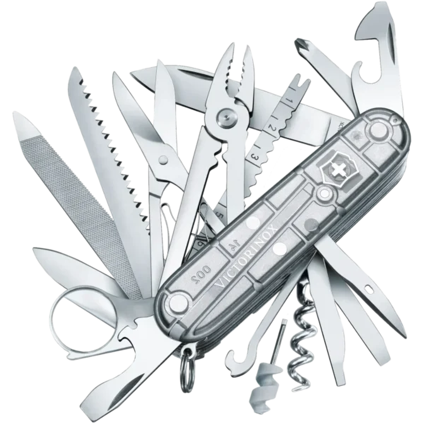 Let's get ready to rumble—the Swiss Champ is here to take on any challenge. With 31 functions and silver transparent scales, this pocket knife is a perfect tool. Keep it in your pocket for your everyday adventures, and take it with you to explore the wildness of nature. From the screwdriver to the corkscrew, the toothpick to the scissors, the Swiss Champ is a true athlete.