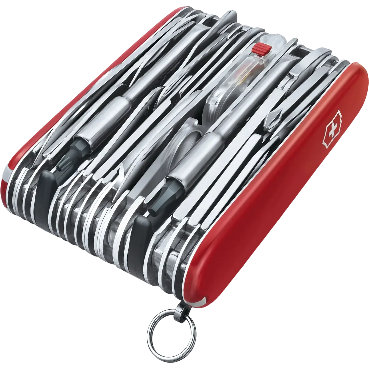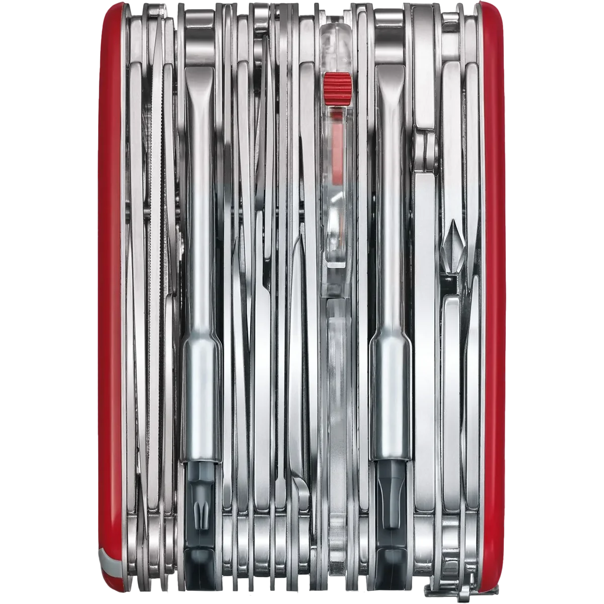 - Functions: Keyring, Large Blade, Small Blade, Electricians Blade, Pruning Blade, Fish Scaler, Nail File, Nail Cleaner, Tweezers, Toothpick, Pharmaceutical Spatula, Scissors, Corkscrew, Can Opener, Bottle Opener, Mini Screwdriver (FH), Fine Screwdriver (FH), Small Screwdriver (FH), Screwdriver (FH), Phillips Screwdriver, Metal Saw, Metal File, Wood Saw, Ruler (cm), Ruler (inches), Magnifying Glass, Stainless Steel Pin, Ballpoint Pen, Watch Opener, Wire Stripper, Wire Scraper, Wire Cutters, Wire Crimping Tool, Multipurpose Hook, Hook Disgorger, Reamer Punch, Chisel, Pliers, Bit Wrench, Bits