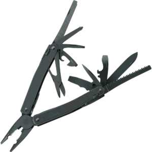 - Functions: Lock Blade, Large Blade, Can Opener, Bottle Opener, Fine Screwdriver (FH), Small Screwdriver (FH), Screwdriver (FH), Phillips Screwdriver, Metal Saw, Metal File, Wood Saw, Wire Stripper, Wire Scraper, Wire Cutters, Wire Crimping Tool, Reamer Punch, Chisel, Pliers, Lanyard Hole, Wire Bender, Crate Opener