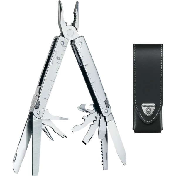 - Functions: Lock Blade, Large Blade, Can Opener, Bottle Opener, Mini Screwdriver (FH), Fine Screwdriver (FH), Small Screwdriver (FH), Screwdriver (FH), Phillips Screwdriver, Metal Saw, Metal File, Wood Saw, Ruler (cm), Ruler (inches), Wire Stripper, Wire Scraper, Wire Cutters, Reamer Punch, Chisel, Pliers, Lanyard Hole, Wire Bender, Crate Opener