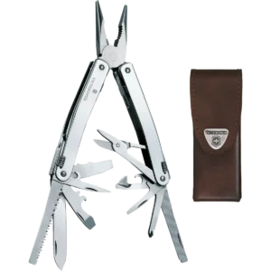 - Functions: Lock Blade, Scissors, Can Opener, Bottle Opener, Mini Screwdriver (FH), Small Screwdriver (FH), Screwdriver (FH), Phillips Screwdriver, Metal Saw, Metal File, Wood Saw, Wire Stripper, Wire Scraper, Wire Cutters, Multipurpose Hook, Reamer Punch, Chisel, Pliers, Lanyard Hole, Wire Bender, Crate Opener