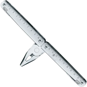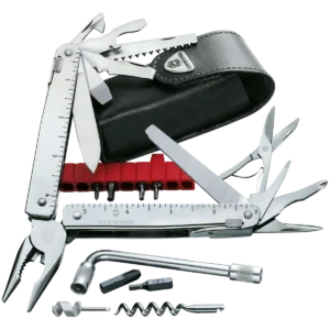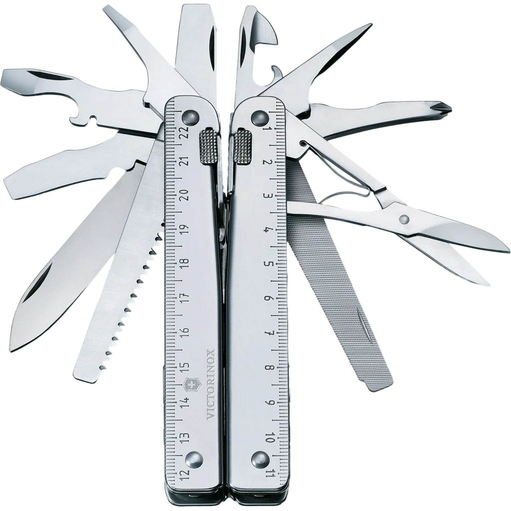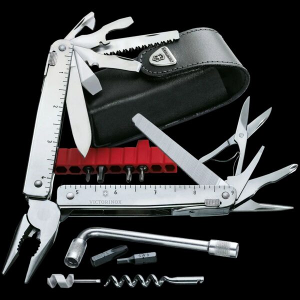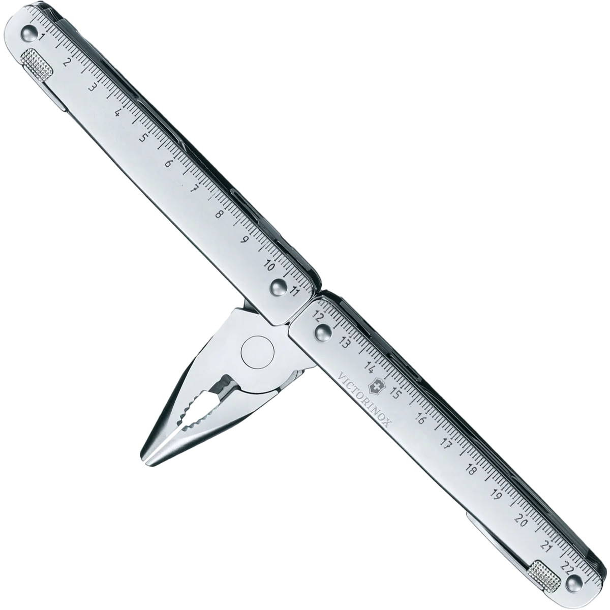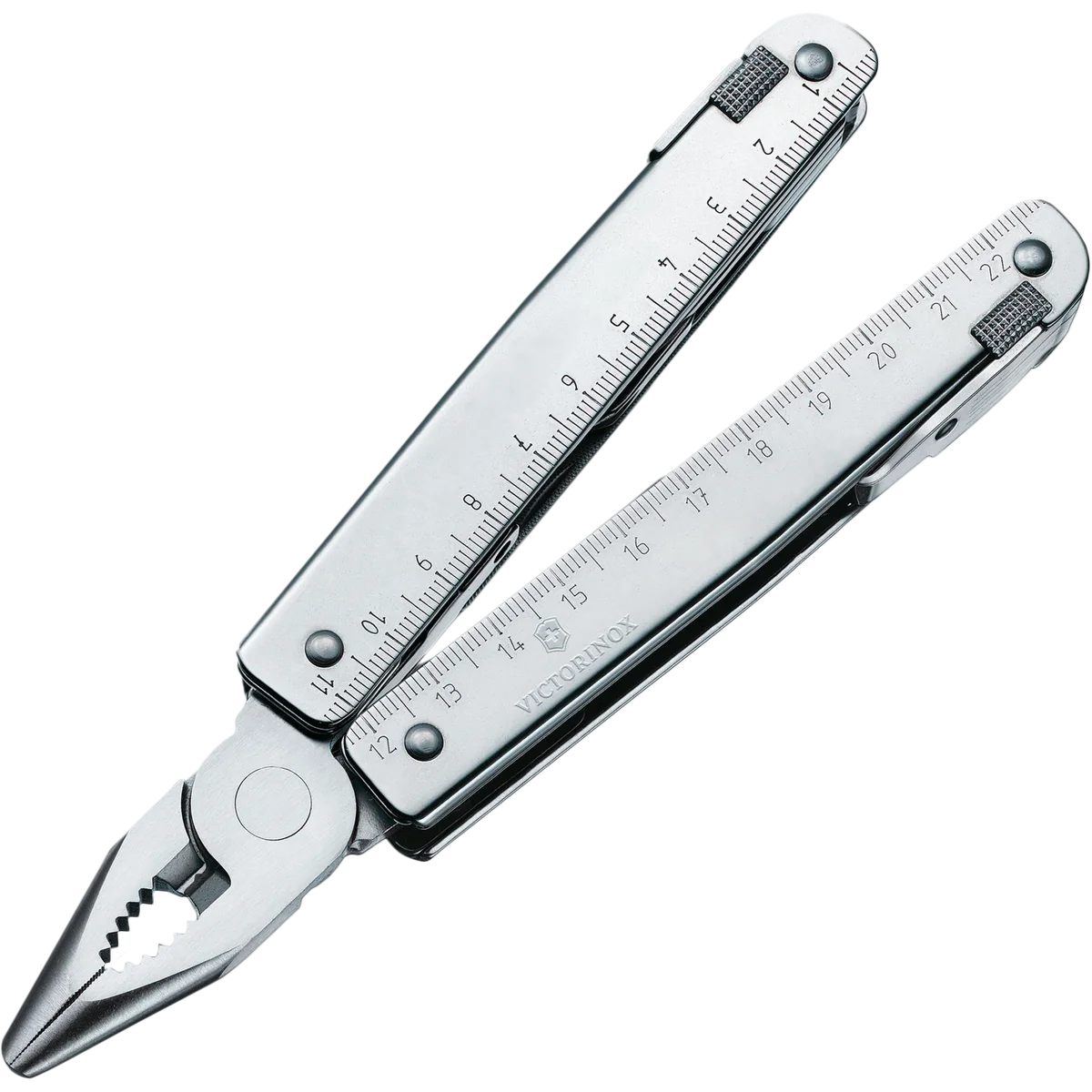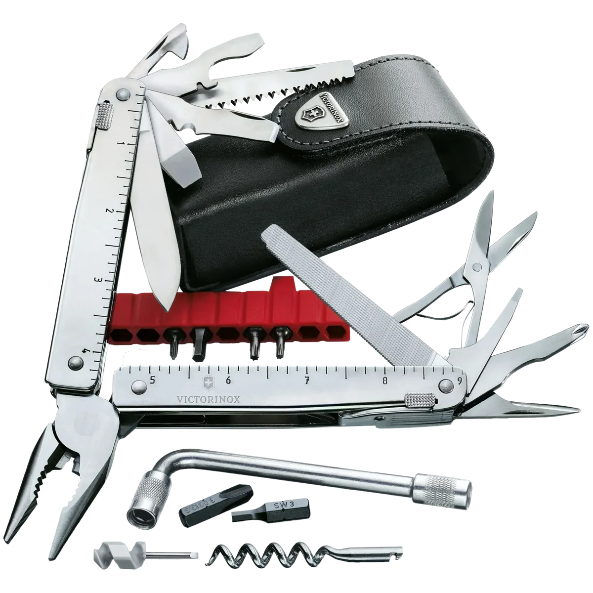 - Functions: Lock Blade, Large Blade, Scissors, Corkscrew, Can Opener, Bottle Opener, Mini Screwdriver (FH), Fine Screwdriver (FH), Small Screwdriver (FH), Screwdriver (FH), Phillips Screwdriver, Metal Saw, Metal File, Wood Saw, Ruler (cm), Ruler (inches), Wire Stripper, Wire Scraper, Wire Cutters, Wire Crimping Tool, Reamer Punch, Chisel, Pliers, Bit Wrench, Lanyard Hole, Wire Bender, Crate Opener, Bits
