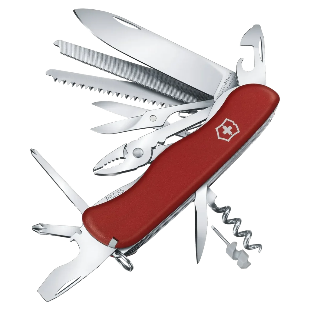 - Functions: Keyring, Lock Blade, Tweezers, Toothpick, Scissors, Corkscrew, Can Opener, Bottle Opener, Mini Screwdriver (FH), Small Screwdriver (FH), Screwdriver (FH), Phillips Screwdriver, Phillips Screwdriver (LF), Metal Saw, Metal File, Wood Saw, Wire Stripper, Wire Cutters, Wire Crimping Tool, Reamer Punch, Pliers