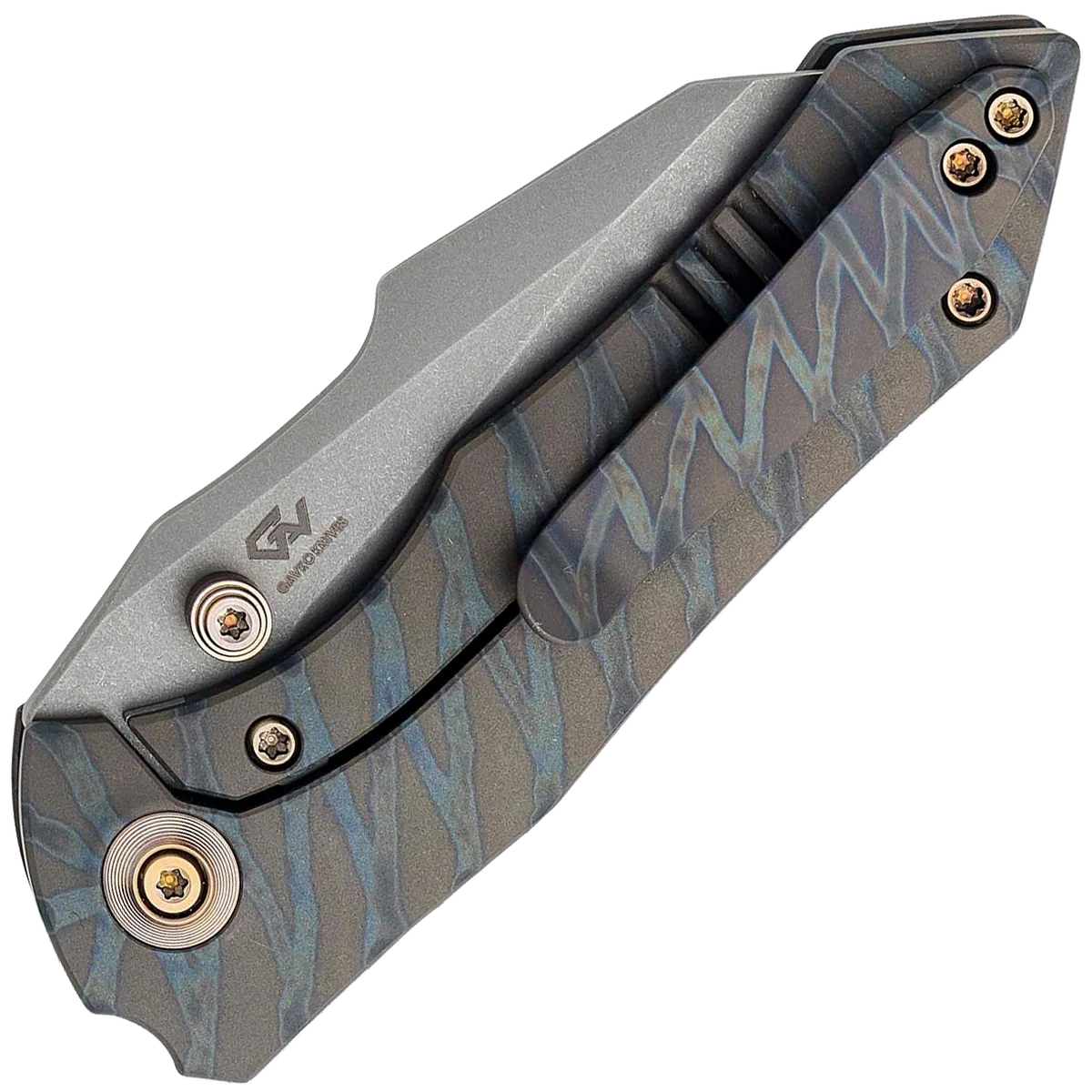 Designed by Michal Gavac of Gavko Knives, the High-Fin is a hard-working folder in Gavko signature style. It's sized just right for everyday carry, its ergonomics are superior thanks to nicely contoured frames, and the blade shape is unique and highly effective. The high hollow grind and harpoon swedge make this modified reverse Tanto blade a powerhouse of cutting potential and the sub-3-inch blade length allows for easy carry while supplying enough blade for precision or heavy work. Premium materials come together to make a highly functional folding pocket knife that's tough enough to handle heavy-duty tasks, but beautiful enough to slide into your pocket for a touch of style. Carries via a right-hand milled titanium pocket clip. This version comes with a grey stonewashed CPM-20CV blade, tiger stripe flamed titanium handle, and gold hardware.