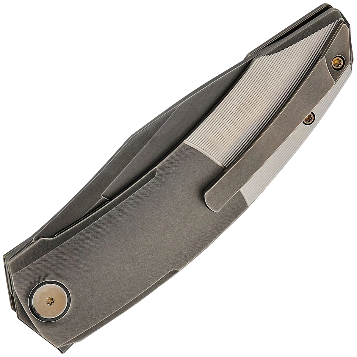 The We Knife Co Sine Wave is a high-performance folding knife built with precision and style in mind. Its 3.98" Bohler M390 stainless steel drop point blade is engineered for superior edge retention and wear resistance, making it a dependable tool for any task. Known for its superior edge retention, hardness, and corrosion resistance, Bohler M390 is a top-tier steel for premium blades. The 6AL4V titanium handle provides durability and a lightweight feel, while the nested liner lock mechanism and caged ceramic ball bearing pivot assembly ensure smooth deployment and secure lock-up, making the knife both practical and easy to use. With an overall length of 8.84 inches and a closed length of 4.86 inches, the Sine Wave Folding Knife balances functionality and portability. The knife weighs 4.96 ounces, offering a substantial feel without being cumbersome. The tip-up right carry pocket clip, also made from titanium, ensures the knife is easily accessible and securely held.