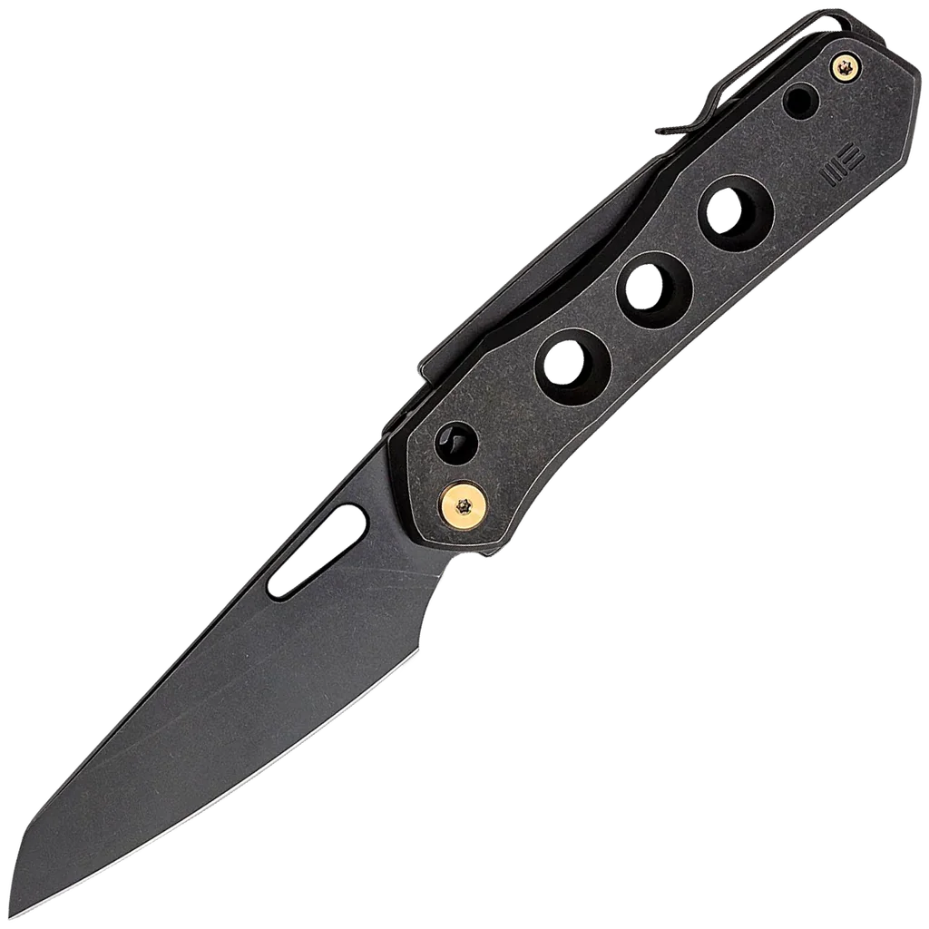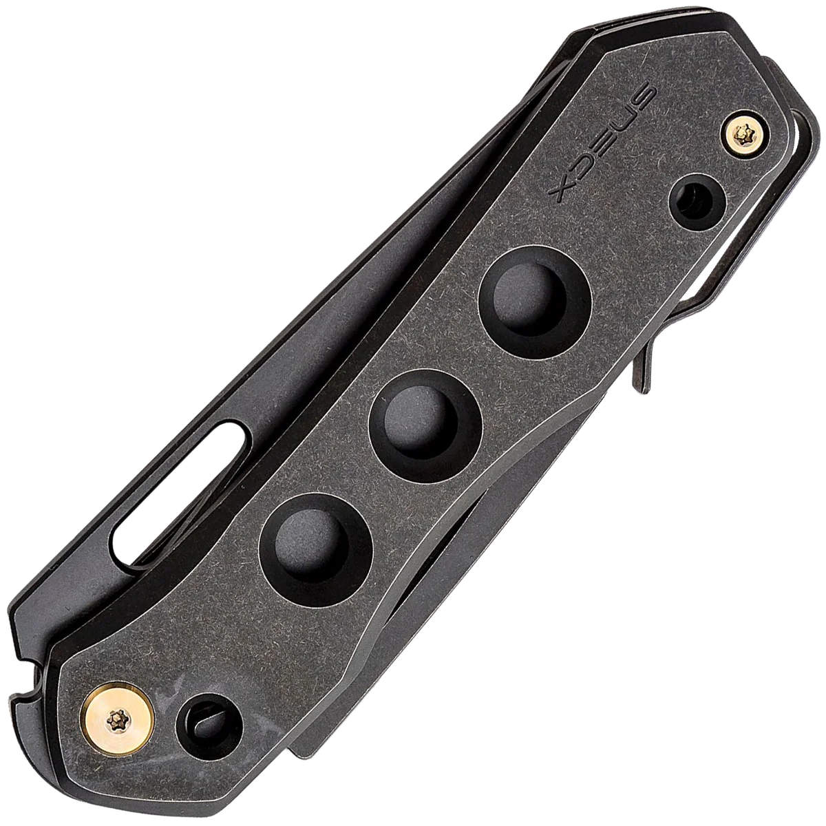 Born from a partnership between WE Knife and Snecx Tan, the Vision R folding knife is a refreshing choice for an EDC knife. The design of the knife is universally ambidextrous thanks to the pocket clip being located on the back of the titanium handles. The simple, streamlined design allows for multiple grips with chamfered edges for comfort and milled holes that provide traction and weight reduction. The thumb hole in the blade allows for easy one-hand opening of the reverse tanto blade and the knife locks up using the innovative Snecx Superlock mechanism. This operates in a similar way to a traditional back lock but the back spine slides backwards to release the blade. This version comes with a black stonewashed CPM-20CV blade and matching titanium handles with bronze hardware.