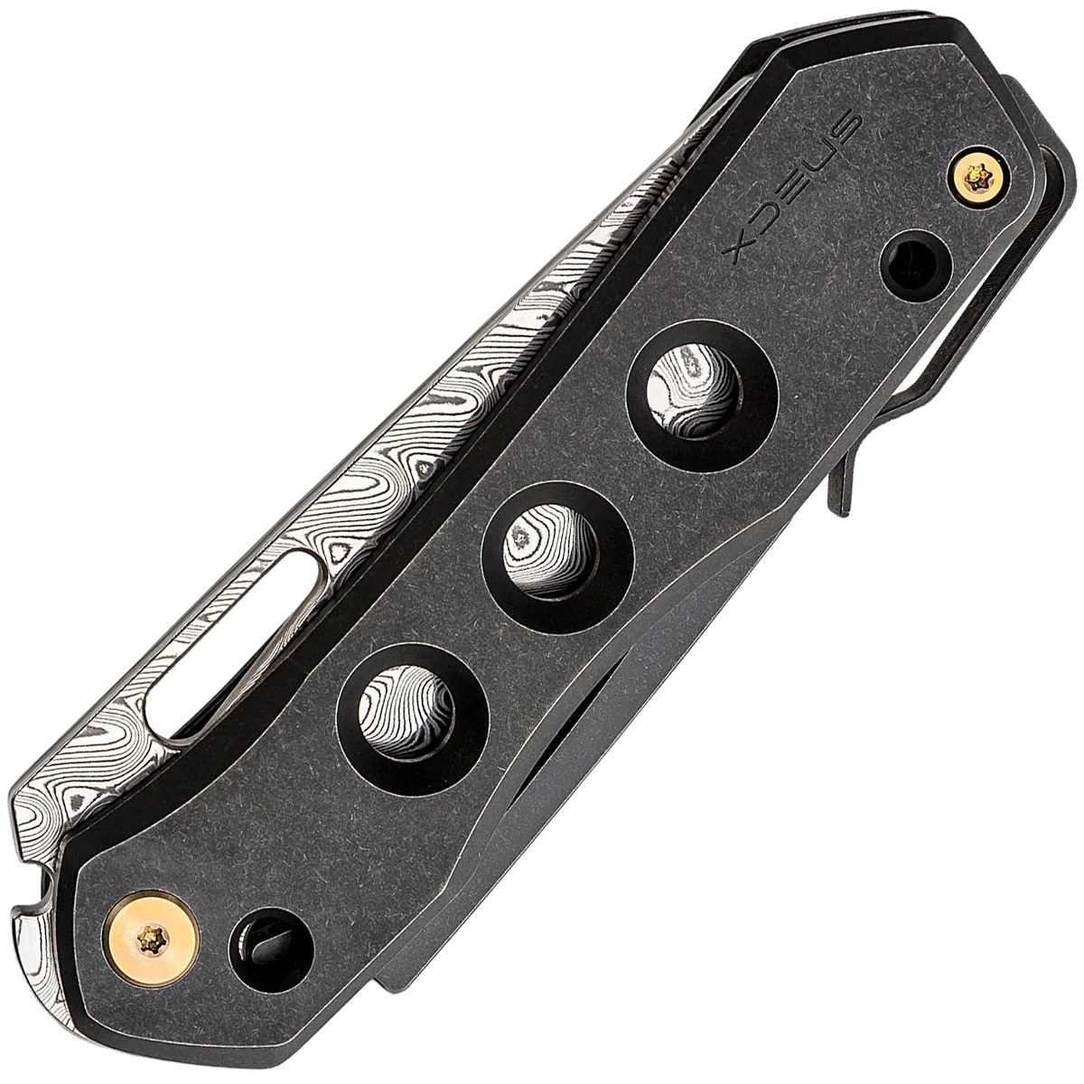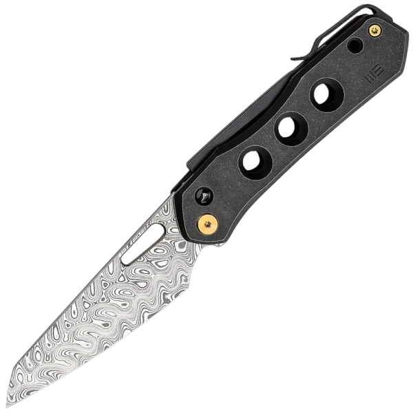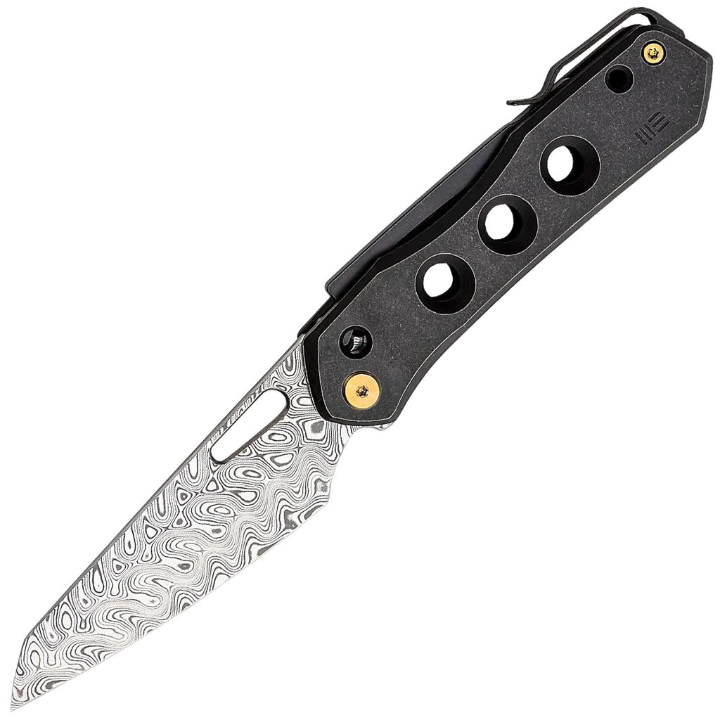 Born from a partnership between WE Knife and Snecx Tan, the Vision R folding knife is a refreshing choice for an EDC knife. The design of the knife is universally ambidextrous thanks to the pocket clip being located on the back of the titanium handles.The simple, streamlined design allows for multiple grips with chamfered edges for comfort and milled holes that provide traction and weight reduction. The thumb hole in the blade allows for easy one-hand opening of the reverse tanto blade and the knife locks up using the innovative Snecx Superlock mechanism. This operates in a similar way to a traditional back lock but the back spine slides backwards to release the blade. This version comes with a stainless Hakkapella pattern Damasteel blade and stonewashed black titanium handles with bronze hardware.