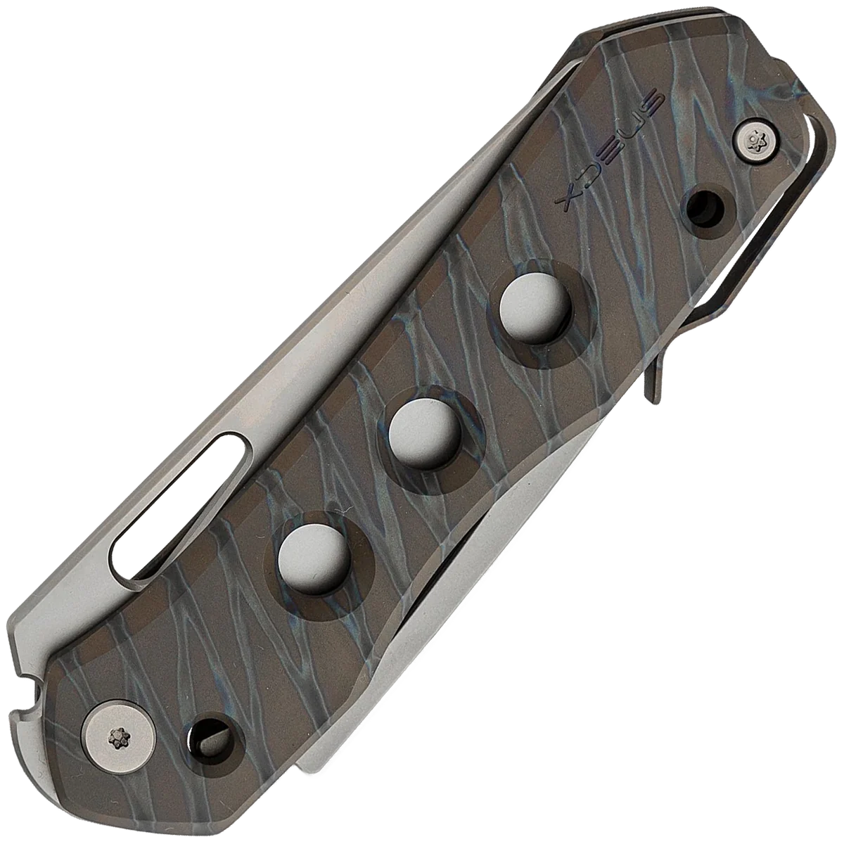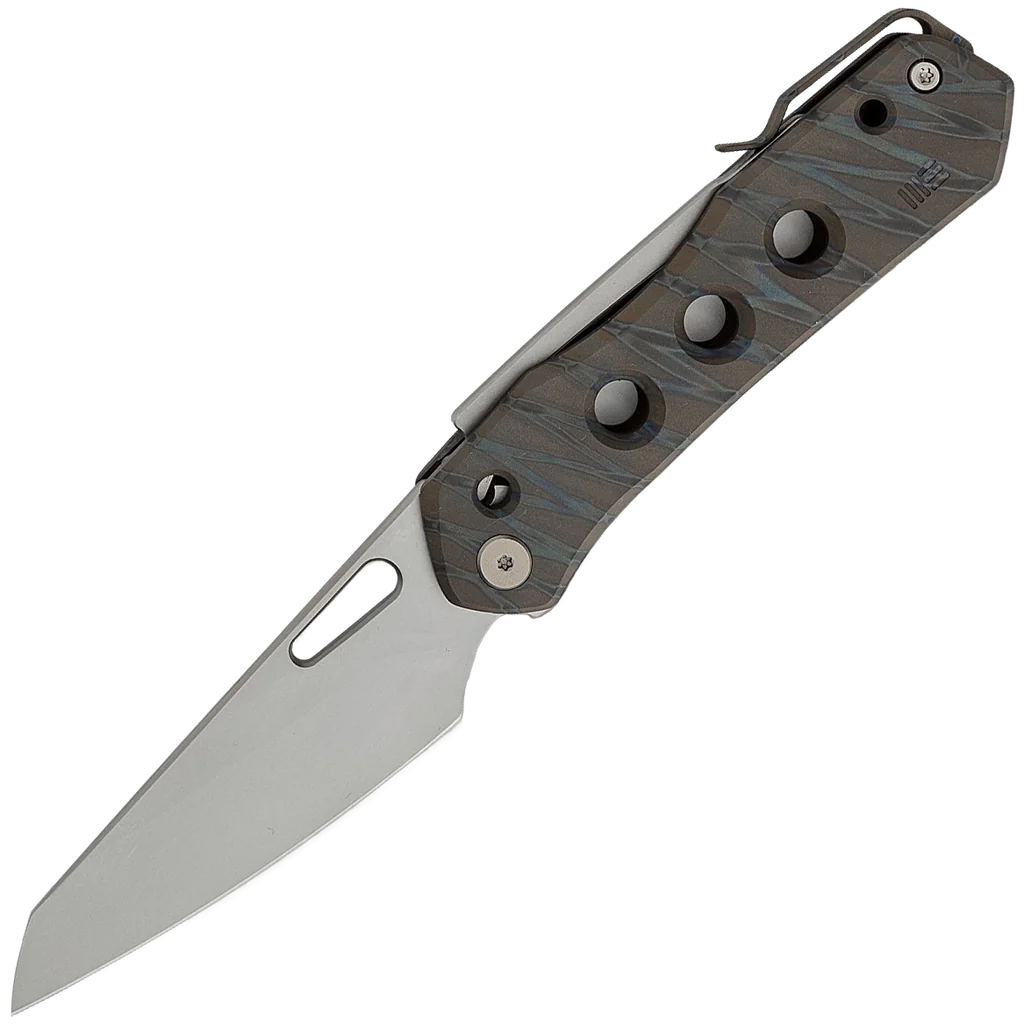 Born from a partnership between WE Knife and Snecx Tan, the Vision R folding knife is a refreshing choice for an EDC knife. The design of the knife is universally ambidextrous thanks to the pocket clip being located on the back of the titanium handles.The simple, streamlined design allows for multiple grips with chamfered edges for comfort and milled holes that provide traction and weight reduction. The thumb hole in the blade allows for easy one-hand opening of the reverse tanto blade and the knife locks up using the innovative Snecx Superlock mechanism. This operates in a similar way to a traditional back lock but the back spine slides backwards to release the blade. This version comes with a bead blasted CPM-20CV blade and tiger stripe flamed 6Al4V titanium handles and hardware.