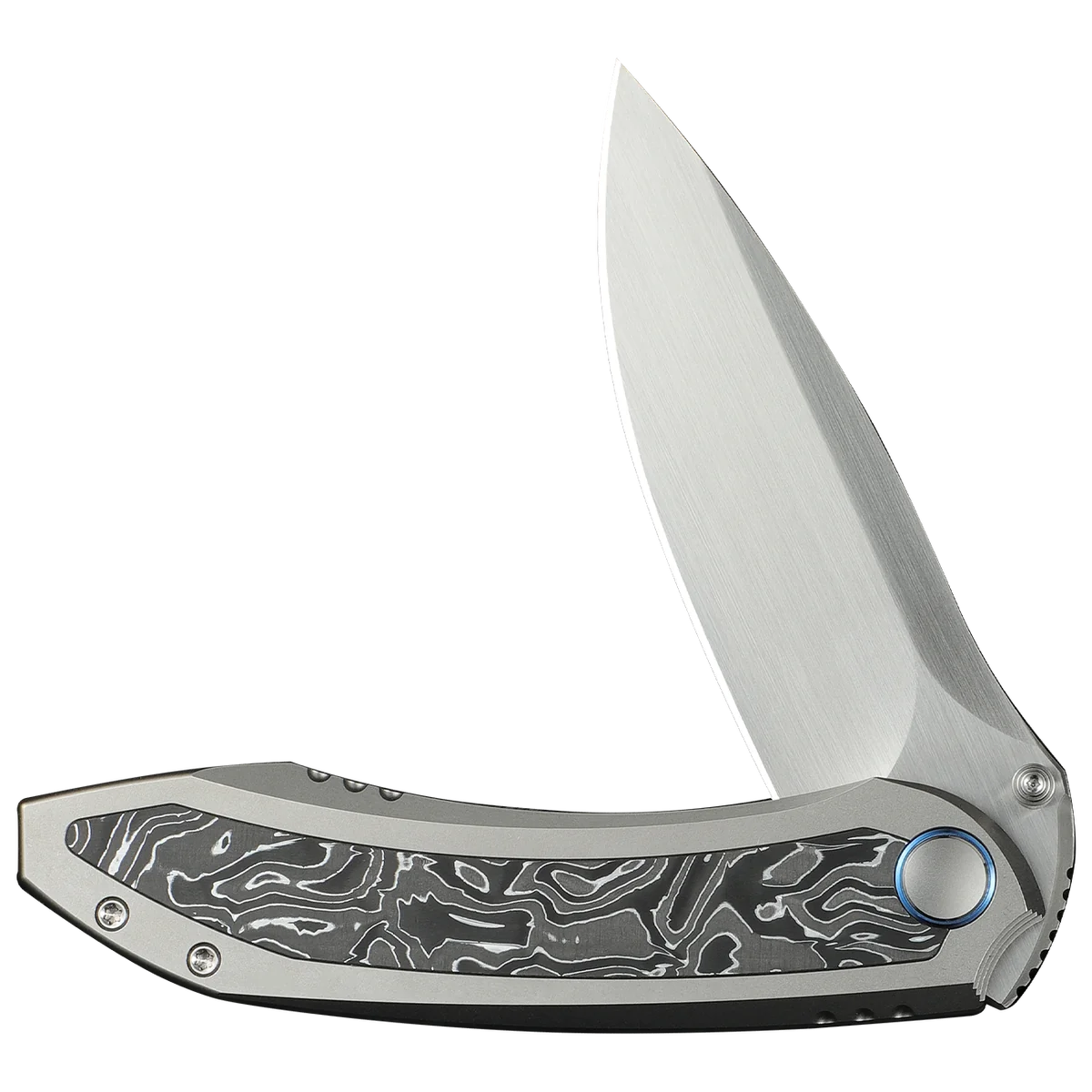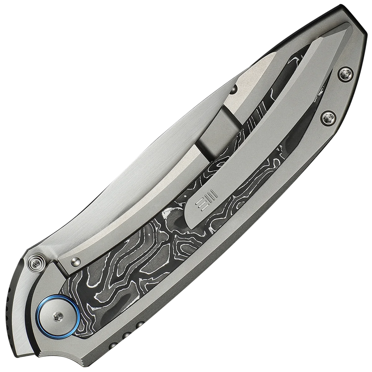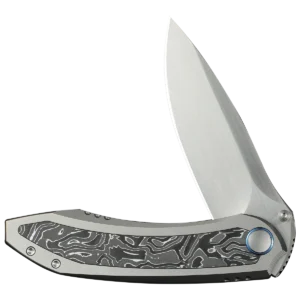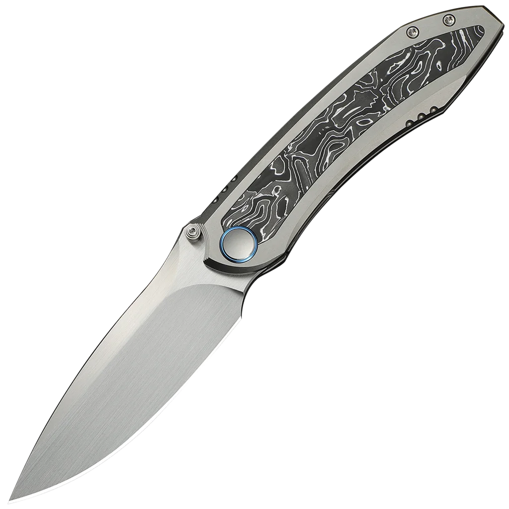 The WE Knife Co. Winsome has an aluminium foil Carbon Fiber/Titanium Handle and a Bohler M390 Steel 3.74" drop point blade with a Satin finish. It utilises a thumb stud opener with a ceramic ball bearing pivot for smooth action and easy single-handed use. A sturdy nested frame lock keeps the folding knife open during use. The titanium pocket clip is mounted for tip-up, right carry.